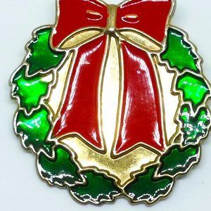 Vintage Red and Green Enamel on Gold Tone Christmas Holiday Wreath Pin Brooch