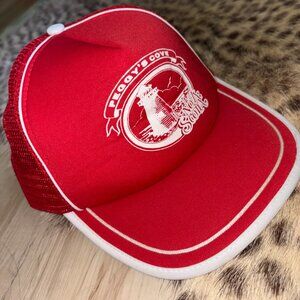 Red and white, 'Peggy's Cove Nova Scotia' memorabilia trucker hat. Adjustable at back.