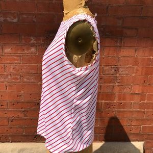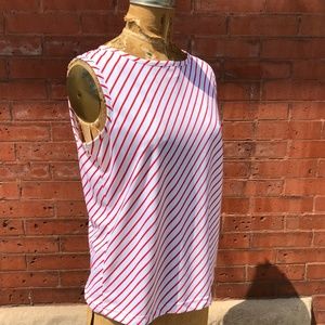Red and white vertical stripe tank top, it's polyester, and the brand is BFA Classics