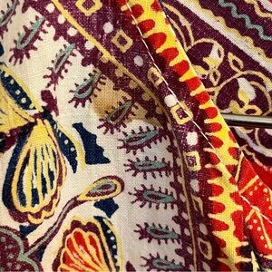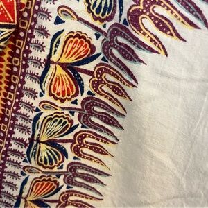 This vintage tunic top features a striking pattern of red, purple, yellow and blue on a cream background, perfect for making a bold statement. Very good vintage condition; there does appear to be one stain on the neckline but it’s not very noticeable because of the pattern and may come out with washing. Bust 23” across, length 28”.