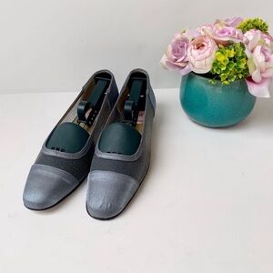 Beautiful and rare vintage Red by Ramon Tenza loafers in an elegant blue-gray colorway. These slip-ons feature a satin-like fabric on the toe and heel, breathable mesh mid-panel, and a low 1” oval heel also wrapped in fabric. The squared toe silhouette adds a refined vintage feel.