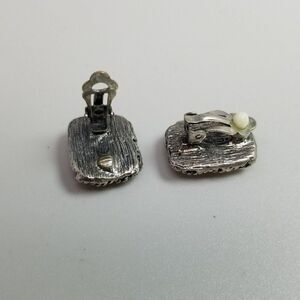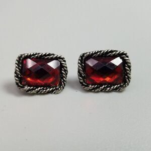 Vintage Red Rhinestone Rectangle Clip On Earrings, Silver Tone Setting, Estate