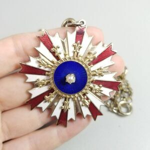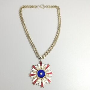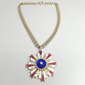 Vintage Red White Blue Enamel Starburst Radiant Pendant Necklace, Fleur De Lis