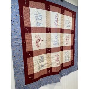 Vintage Redwork Crib Quilt – Sunbonnet Sue/Overall Sam Hand-Embroidered, Cottage