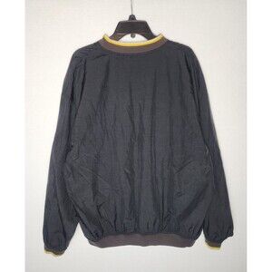 Pre owned vintage condition. Black windbreaker with yellow and white stripes on neck and sleeves. Can be Steelers colors etc. One scratch spot at the bottom of the front shown. White stripes on sleeves are a little dingy from use.