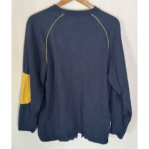 This Vintage Reebok Sweatshirt is a nostalgic piece with a Y2K aesthetic, featuring a puffy 3D spellout logo and rugby elbow patches. Made from a blend of polyester and cotton fleece fabric, this crew neck sweatshirt in blue showcases a graphic print design with accents of the Reebok logo. With a regular fit and heavyweight construction, this pullover sweatshirt is perfect for outdoor activities like walking and running, making it a versatile addition to any wardrobe. The retro vibe and classic style make it a standout choice for those looking to add a touch of hipster or preppy flair to their look.