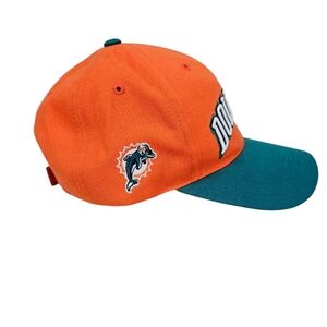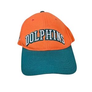 Features vintage 90s Reebok NFL Miami Dolphins baseball hat, snapback, wool blend, colorblock orange and teal, 3D embroidery on front "Dolphins", Miami Dolphins logo embroidered on right side, sportswear, streetwear, unisex.