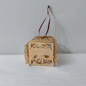 Add a touch of nostalgia to your holiday decor with this exquisite Gold Plated Vintage Reed & Barton Tree Castle Ornament from 1977. Perfect for collectors and holiday enthusiasts alike. Measures about 2.5 inches square. Includes hanging ribbon.