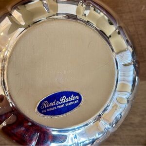 Vintage Reed & Barton brand silver-plated lotus flower frog. Tarnished throughout as shown. There is a split in the metal inbetween 2 petals as shown in close-up photograph. Overall good used condition with that 1 piece of damage. 3 Piece Set