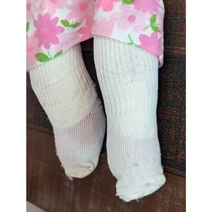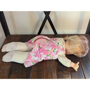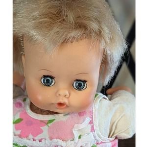 Pre owned condition. Eyes open and close. Arms seem backwards. Has stains and scuff marks. Clothing has wear. Smoke free dog friendly. About 16 inches.
