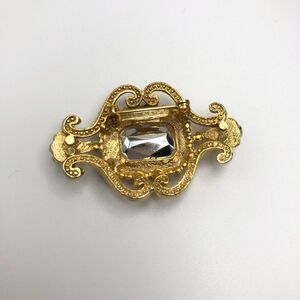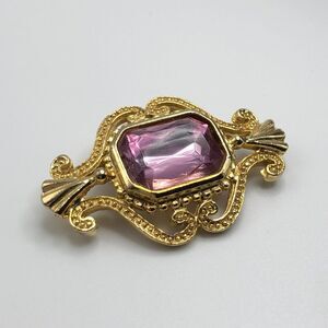 Vintage Regency Brooch Pin Gold Purple Glass Rhinestone Scroll Radiant Cut