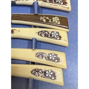 The Vintage Regent Sheffield 19 + 6 Pcs Golden Prestige Cutlery Set is a luxurious flatware set that includes knives, forks, servers, and cake/pie slices. Made of stainless steel with a desert flower handle pattern, this set exudes elegance and sophistication. Dating back to the 1960s, this original set is a sought-after collectible item for those who appreciate fine cutlery. With a note to hand wash only, this set is a timeless treasure that will elevate any dining experience.