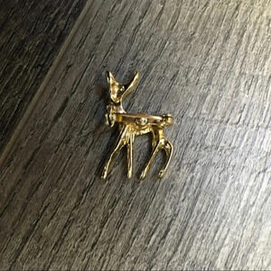 Vintage Reindeer Pin Brooch. Green rhinestone eye. Polka dot look. There is some wear on the deer. In used condition. See pics for conditions. No Modeling or trades. P17