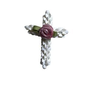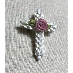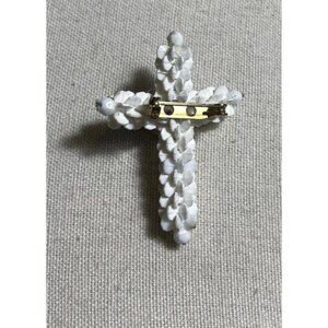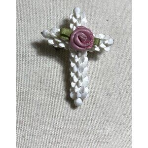 Vintage Religious Jesus Cross Christianity White Beaded Rose Brooch Sz 2”
