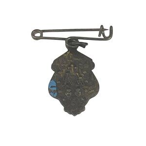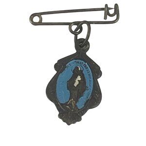 This vintage religious medal pin is an intriguing piece of devotional art. Featuring the revered Black Madonna and Child, it serves as a powerful symbol of faith and protection. The intricate design, set in a striking blue oval, adds a touch of historical charm to any collection.