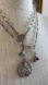 This unique piece combines two vintage rosaries and is crafted with sterling silver and brass chains.