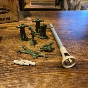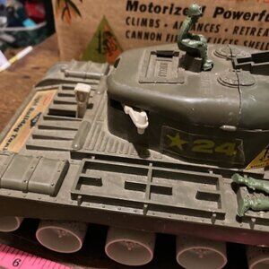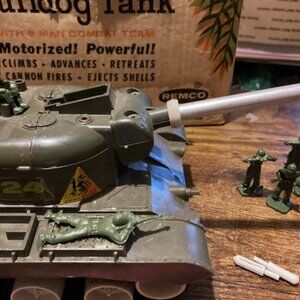 Vintage Remco Bulldog tank from 1963. This unique toy belongs to the monkey division 706 and come in its original box. This is a great piece for any collector. Unfortunately, the old batteries were left in, and that part rusted out. One of the springs fell out so no connection and it would not work. But it does come in the box and has army men and some ammo. See pictures