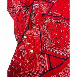 Rare and collectible! This vintage Remuda Western Wear button-up is a true western classic. Features bold red & navy bandana print, pearl snap front and cuff closures, and classic western yoke styling. Slightly stretchy for comfort. From a limited-run western label, making it a rare find you won’t see often!