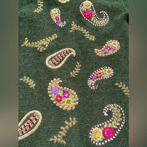 STUNNING Forest Green/Tan chenille type yarn (very soft) cardigan with handmade large paisleys embroidered over the sweater and embroidered multicolor flowers inside the paisleys, two front pockets and removable fur collar. This is truly a rare & hard to find Rena Lange! Color on label is Forest/Camello. Imported.