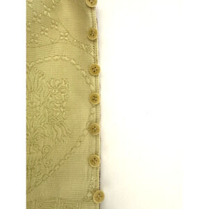 Vintage Rena Lange Coat and Pant Set with Beaded Belt - Size 6 Soft Yellow-Green Jacquard Silk and Wool Blend This is an elegant, exquisite coat and pant set perfect for a special occasion. Features: Coat * Round neckline with button front closure (17 buttons with loop fastening) * Bronze sequins trim around neckline and down the front * Thread belt loops * Seam pockets * Fully lined; cupro * Measurements: bust 34", waist 32", sleeve length 24", length 39" Pants * Side zip closure * Straight, slightly tapered leg * Unlined * Measurements: waist 34", rise 11", hip 38", inseam 31", leg opening 7.5"