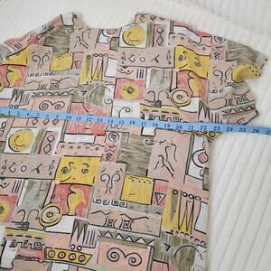 vintage blouse, retro top, Renaissance Sportswear, abstract print blouse, geometric print shirt, 80s blouse, 90s blouse, oversized top, boxy fit shirt, short sleeve blouse, vintage retro fashion, colorful blouse, statement top, festival shirt, artsy blouse, mid-century style top, eclectic fashion, women’s large blouse, vintage patterned shirt
