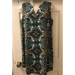 Vintage Renee C. Women's Paisley Geometric Sleeveless Summer Dress Medium Pull Slip On Shirt Hem. Dress is pre-owned. Please see all photos for visible condition. Doesn't really look worn at all. There are no pockets. V-neck. Mainly green and white with accent colors. Approximately 35 inches long and 20 inches pit to pit. 100% polyester. RN GA8625-1. Style 1514DRU. Super cute casual or professional dress. Hits just below knee but please refer to length measurement to determine where it would hit on your legs.