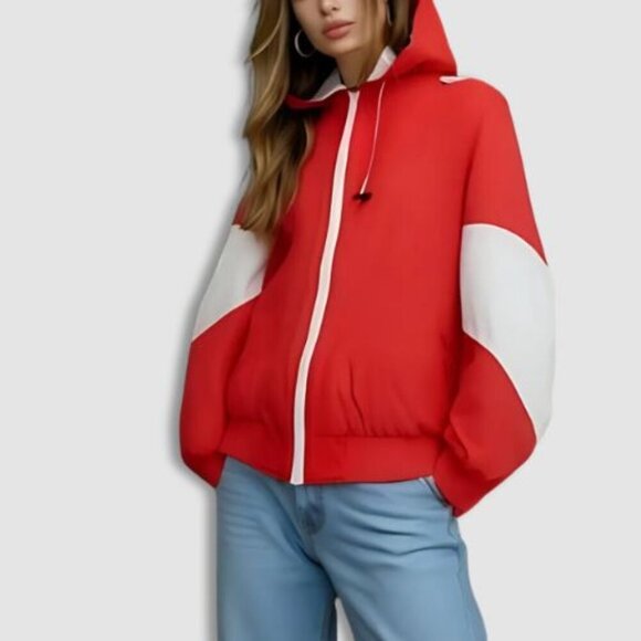 Vintage RENNOC Classic sporty windbreaker jacket in bold red with contrasting white accents. Features a hood with drawstrings, full zip front, and quilted lining for lightweight warmth and comfort.