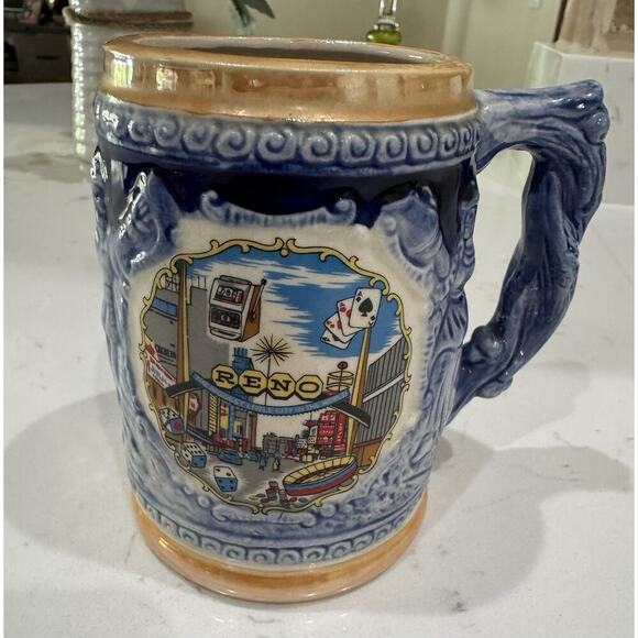 This is a vintage ceramic coffee mug from Japan makers. It is a souvenir from Reno and features a design of buildings and monuments. The mug is blue in color and has an antique style. It is a regular size and is perfect for coffee lovers.
