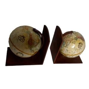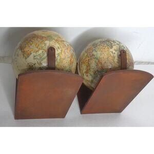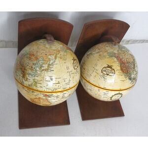 These bookends feature miniature globes mounted on metal stands. The globes themselves show a classic map design.