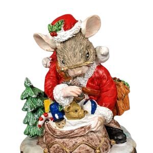 This charming vintage resin Christmas mouse music box is sure to delight collectors and holiday enthusiasts alike! Dressed in a Santa suit, this adorable mouse is busy placing a teddy bear into his sack while perched atop a festive drum-shaped base. The music box is in excellent working condition and plays a classic Christmas tune (though were not sure which one - its a sweet surprise!).