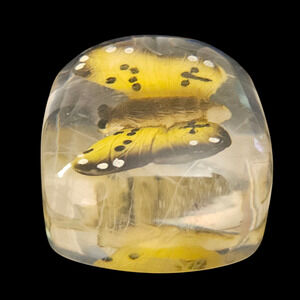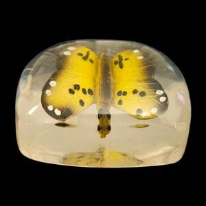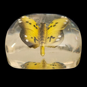 Charming vintage resin (lucite/acrylic) paperweight featuring a detailed yellow butterfly encased within clear resin. The butterfly appears three-dimensional when viewed from different angles, giving this piece a striking and unique look. Perfect as a desk accessory, display collectible, or gift for butterfly lovers.
