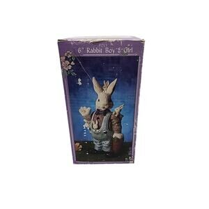 This vintage resin figurine features a rabbit dad surrounded by baby rabbits, making it a charming Easter decoration. Hand-painted with a matte finish, the figurine stands at 6 inches tall and showcases a country style design. The colorful piece depicts bunnies in a playful and whimsical manner, perfect for adding a touch of spring to any room in your home. Made of resin and ceramic materials, this figurine comes boxed and is suitable for indoor display.