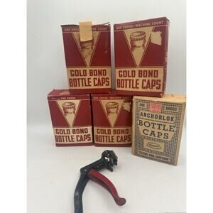 The product is a set of Vintage Gold Bond Bottle Caps, including 5 full boxes and a tool for collecting. These collectible items feature a theme of Food & Beverage, specifically showcasing the iconic Gold Bond brand. Perfect for collectors of advertising memorabilia or vintage food and beverage items, this unique set offers a nostalgic touch to any collection.