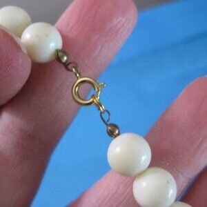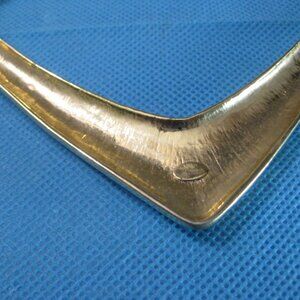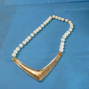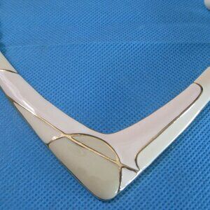 V shaped metal / enamel accent at center of necklace with beads either side.