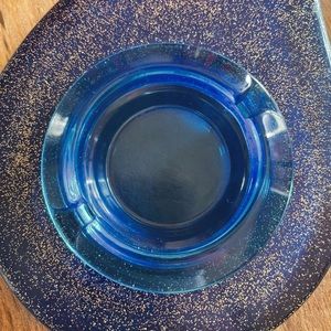 OMG I freakin love this thing. Coolest looking ashtray I’ve ever seen. If I didn’t care to ash my spliffs in it I’d totally keep it, but I think it might sadden me a little to dirty it up! It’s almost too cool to use! 🤣🙃 I know someone will make good use of it though. Blue plastic resin piece with silver sparkles in it. Blue glass ashtray is removable! It looks like there is a small defect in the glass, but you can barely tell when it’s inside the resin piece. Otherwise in excellent vintage condition! Felt on the bottom is slightly worn. Measurements are for the whole piece.