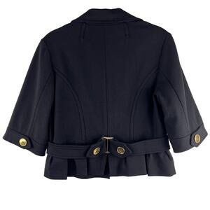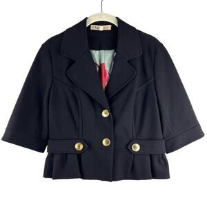 Cropped peplum jacket with wide half sleeves has a lapel collar, gold-plated buttons, and a cute buckle detail in the back. Lining has a pen mark, see photos.