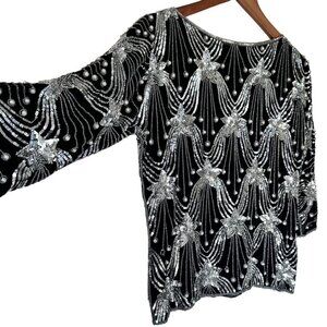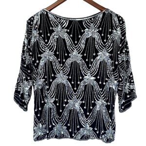 Vintage Retro Black Hand-Beaded Sequin Women's Top 100% Silk Size Medium