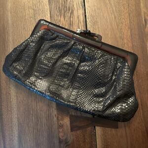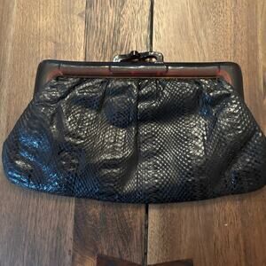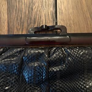 Vintage Retro Black Snakeskin & Leather Clutch Purse With Brown Lucite Frame