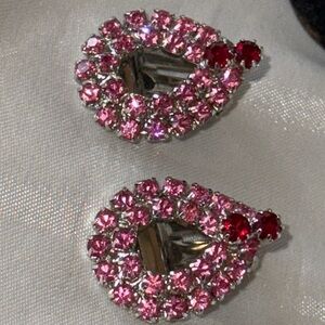 Add a pop of vintage glamour to your jewelry collection with this dazzling pink and red rhinestone set! This matching set includes a curved brooch and a pair of stunning teardrop clip-on earrings, both encrusted with brilliant pink and red rhinestones set in silver-tone metal. The earrings feature bold red accents and a multi-layered design for maximum sparkle, while the brooch curves beautifully with deep pink stones. Perfect for collectors, special events, or retro lovers looking to stand out.