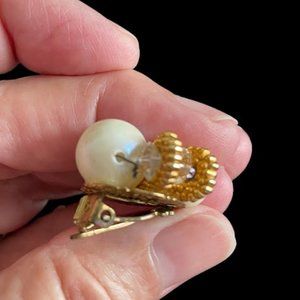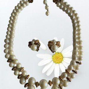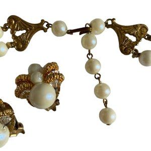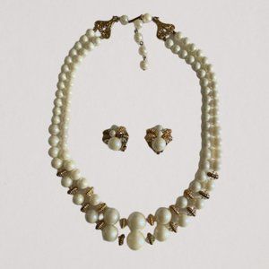 Vintage Retro Chunky Faux Pearl & Gold Tone Crystal Necklace Earrings Set 1950's