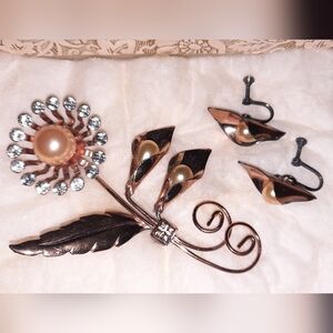 Vintage Retro Copper Tone Floral Brooch & Earrings