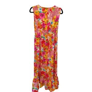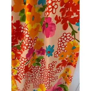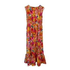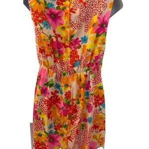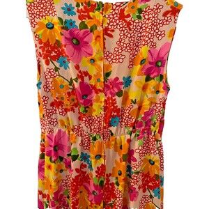 * Fantastic multi-color floral dress featuring vibrant orange, purple, yellow, red, and blue flowers on a pale pink background.