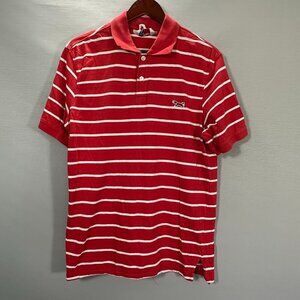 Vintage Retro Fox Polo Shirt Mens Large Red White Cotton Stripe Short Sleeve