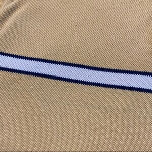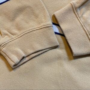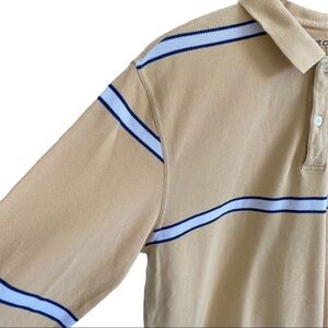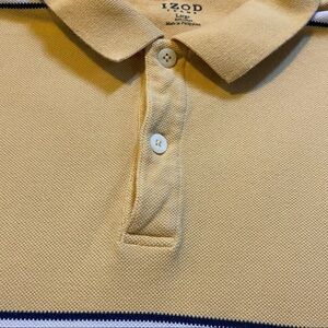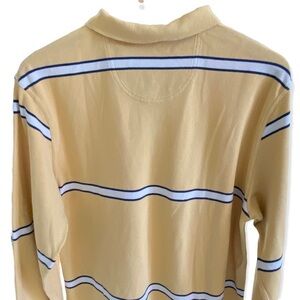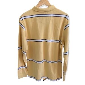 IZOD Jeans long-sleeved rugby shirt. Collared. Two buttons at neck. Small slits at sides of hem. Mustardy-yellow-gold color with navy blue and white stripes. 100% cotton.