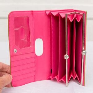 This wallet is made of faux patent leather. It is a tri-fold accordion style wallet with lots of space. It has 12 credit card slots and 1 ID slot, 3 multifunctional slots and 1 bill slot. The kiss lock clasp opens in to 2 more slots for bills or change. You will notice in the last photo there is a small flaw near the clasp. 7.5" (L) X 4" (W) X 1.25" (D)