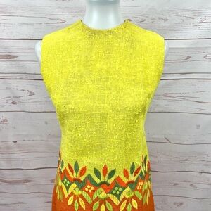 Vintage Retro Mod Embroidered Floral Shift Dress. Material has a textured burlap linen feel to it and is fully lined. Young Naturals by Barnsville, Union made garment. Fun bright colors! There are some sections where the material has slight thinning, producing a slight shade variance. Overall dress is in great vintage condition. High neck, drop waist and mod shift silhouette. Covered button back closure. Vintage size 12 and fits like a Modern Medium. See flat measurements below.