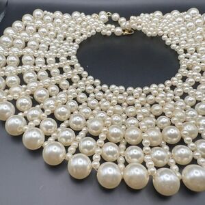 Stunning vintage faux pearl statement bib necklace featuring graduated multi-strand pearls in a dramatic collar design. This bold piece drapes beautifully around the neckline, making it the perfect accessory for formal events, weddings, or evening wear.