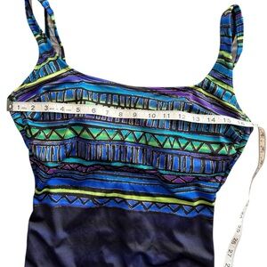 🌊 Vintage Retro One-Piece Swimsuit Blue Green Geometric Print Sz 12/14 🌊
