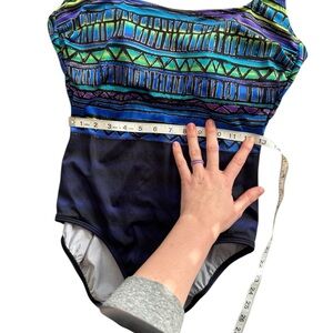 vintage swimsuit, retro one piece swimwear, blue green bathing suit, women’s size 12/14 swim, geometric print swim, 80s 90s swimsuit, vintage swim fashion