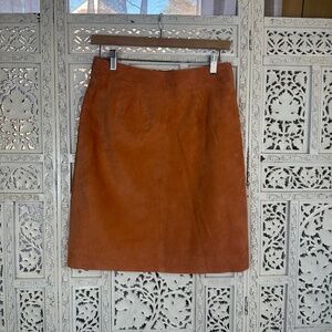 OMG the most gorgeous suede skirt. Color is the most accurate in the model photo. This is a real wrap skirt and uses two buttons for closure and hits right above the knee. Tiny spot on the front. Tagged size 4 but can also fit 6. Waist across 14" hips 19" total length 20.5"